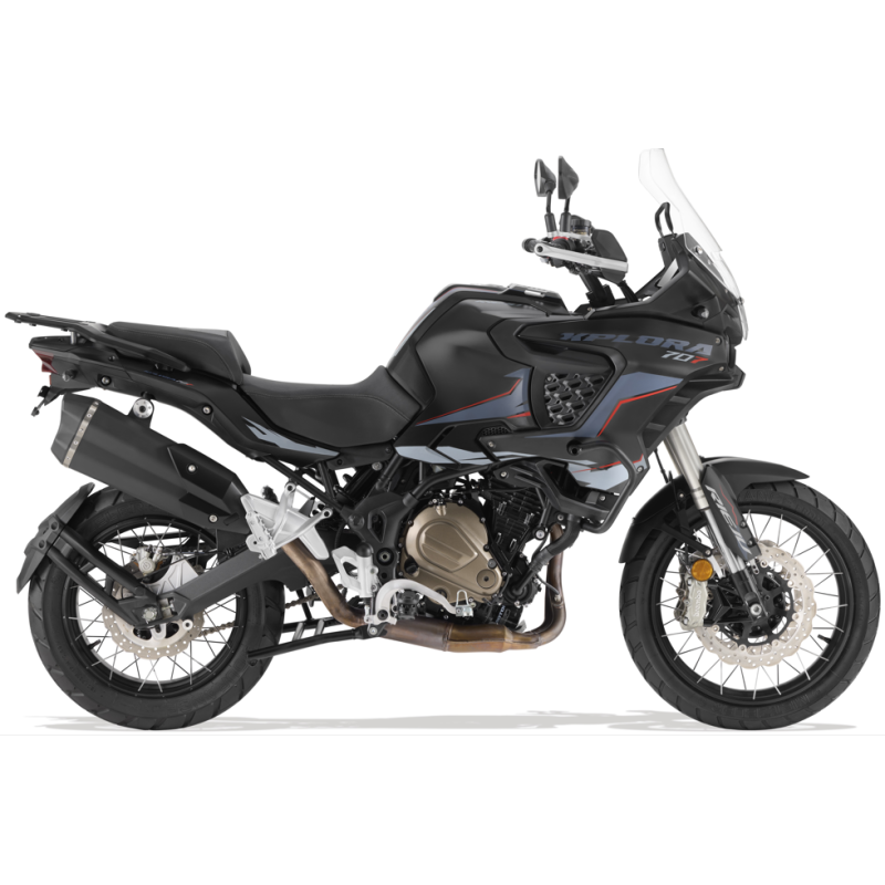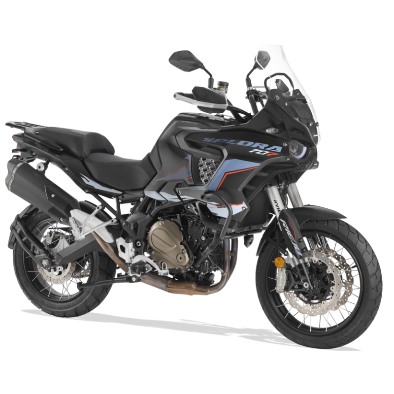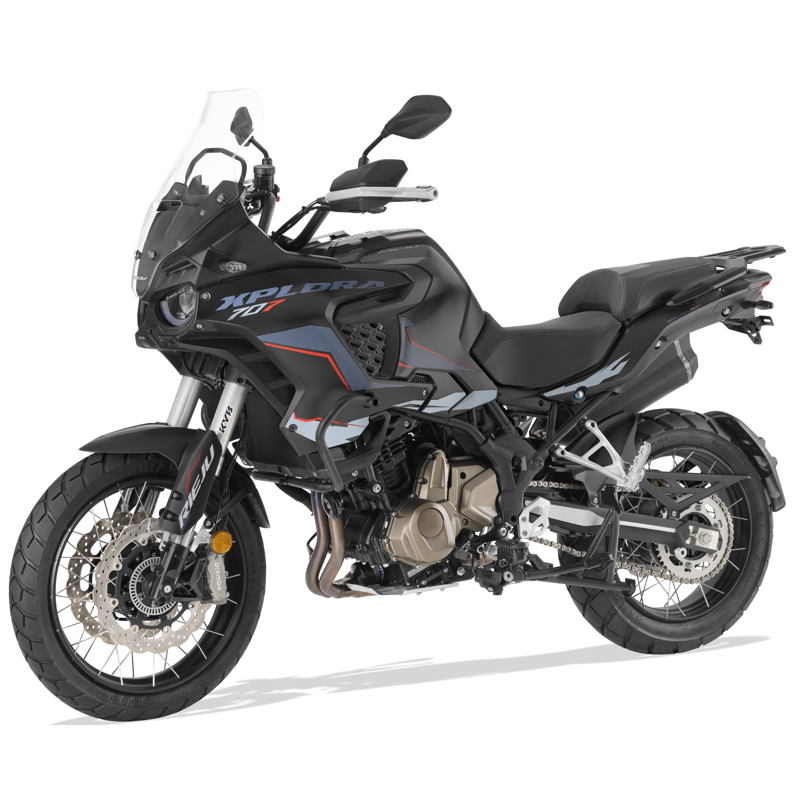 Su potente motor bicilíndrico 4T de 700 cc, homologado según la normativa EURO 5+, entrega una respuesta rápida y precisa en cualquier situación gracias a sus 70 CV de potencia y un par máximo de 70 Nm. Equipa suspensiones KYB regulables, frenos Brembo de alto rendimiento y un Sistema ABS Bosch de doble canal desconectable, que garantizan una conducción segura y eficiente sobre cualquier superficie. Pensada para afrontar las rutas más exigentes, la Xplora 707 incorpora llantas radiadas de aluminio de 19” en la rueda delantera y 17” en la trasera, montadas sobre neumáticos tubeless que aseguran un agarre sobresaliente fuera del asfalto y ofrecen una polivalencia total aportando seguridad, control y rendimiento.